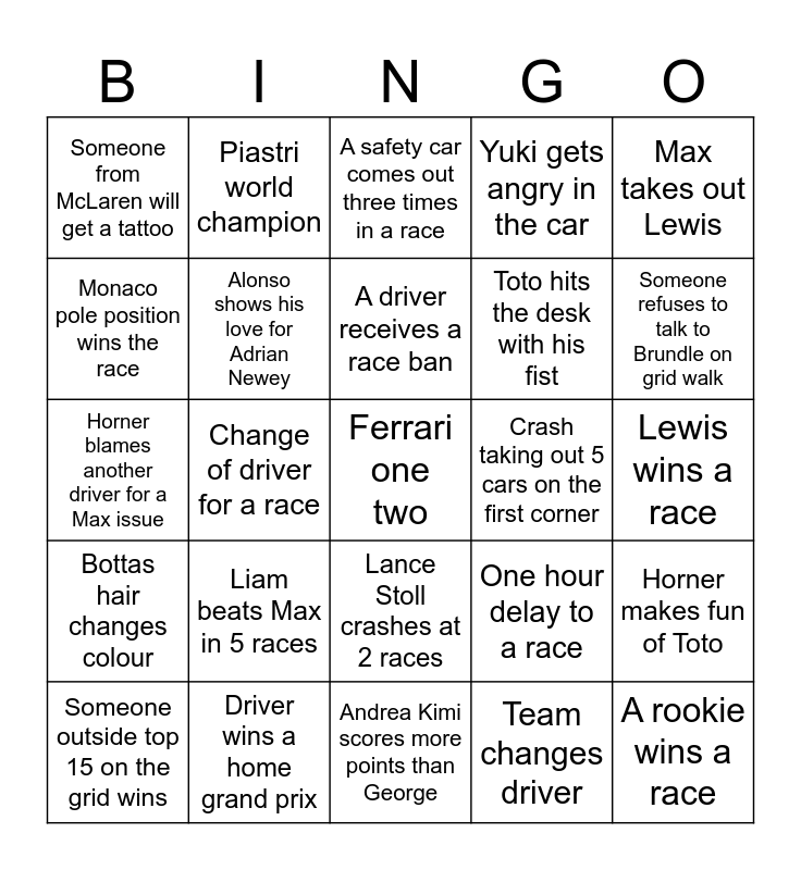 This bingo card has a free space and 25 words: Liam beats Max in 5 races, Andrea Kimi scores more points than George, A driver receives a race ban, Someone outside top 15 on the grid wins, Max takes out Lewis, Someone from McLaren will get a tattoo, Monaco pole position wins the race, Piastri world champion, Crash taking out 5 cars on the first corner, Lance Stoll crashes at 2 races, Toto hits the desk with his fist, Horner blames another driver for a Max issue, One hour delay to a race, Horner makes fun of Toto, Alonso shows his love for Adrian Newey, Charles complains about Lewis, Lewis wins a race, A safety car comes out three times in a race, Someone refuses to talk to Brundle on grid walk, Change of driver for a race, A rookie wins a race, Driver wins a home grand prix, Bottas hair changes colour, Yuki gets angry in the car and Team changes driver.