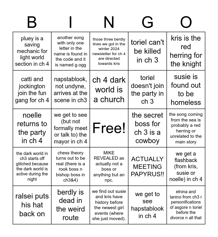 This bingo card has a free space and 24 words: chess theory turns out to be real (there is a rook boss n bishop boss in ch3&4), berdly is dead in the weird route, ch 4 dark world is a church, ralsei puts his hat back on, kris is the red herring for the knight, pluey is a saving mechanic for light world section in ch 4, catti and jockington join the fun gang for ch 4, another song with only one letter in the name is found in the code and it is named g.ogg, the secret boss for ch 3 is a cowboy, MIKE REVEALED as actually not a boss or anything but an npc., toriel doesn't join the party in ch 3, noelle returns to the party in ch 4, ACTUALLY MEETING PAPYRUS!!, we get a flashback (from kris, susie or noelle) in ch 4, napstablook, not undyne, arrives at the scene in ch3, we get to see hapstablook in ch 4, the song coming from the sea is probably a red herring or unrelated to the main story, those three berdly lines we got in the winter 2024 newsletter for ch 4 are directed towards kris, susie is found out to be homeless, we get to see (but not formally meet or talk to) the mayor in ch 4, elnina and lanino from ch3 r personifications of asgore n toriel before the divorce n all that, the dark world in ch3 starts off glitched because the dark world is active during the night, toriel can't be killed in ch 3 and we find out susie and kris have history before the newest girl events (where she just moved)..
