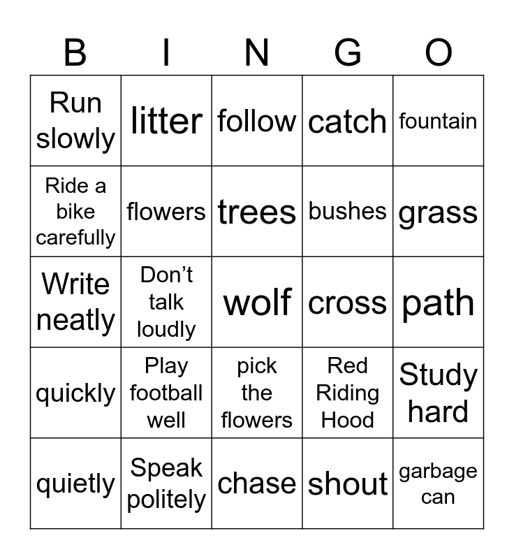 This bingo card has 25 words: Play football well, chase, trees, quietly, fountain, Run slowly, Ride a bike carefully, litter, cross, pick the flowers, bushes, Write neatly, Red Riding Hood, Study hard, flowers, garbage can, path, follow, grass, Don’t talk loudly, wolf, Speak politely, quickly, catch and shout.