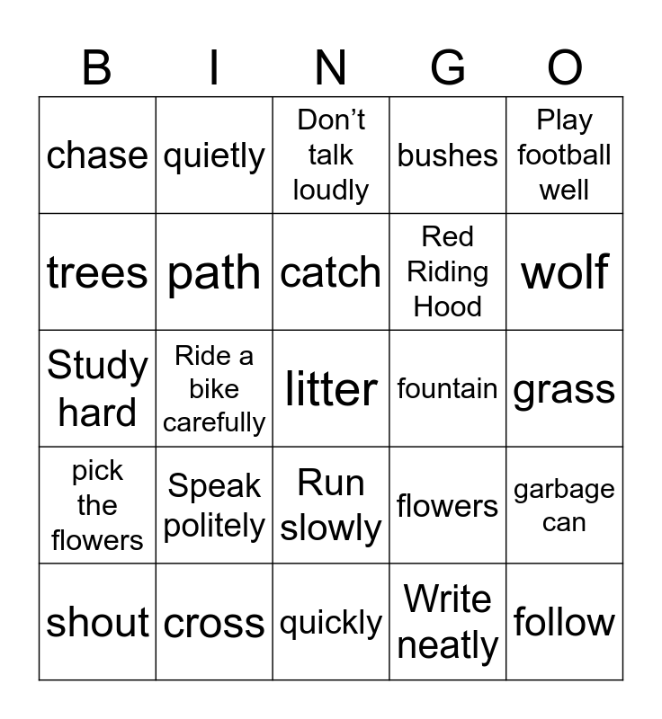 This bingo card has 25 words: Speak politely, quickly, catch, shout, Play football well, chase, trees, quietly, fountain, Run slowly, Red Riding Hood, Study hard, flowers, garbage can, path, follow, grass, Don’t talk loudly, wolf, Ride a bike carefully, litter, cross, pick the flowers, bushes and Write neatly.