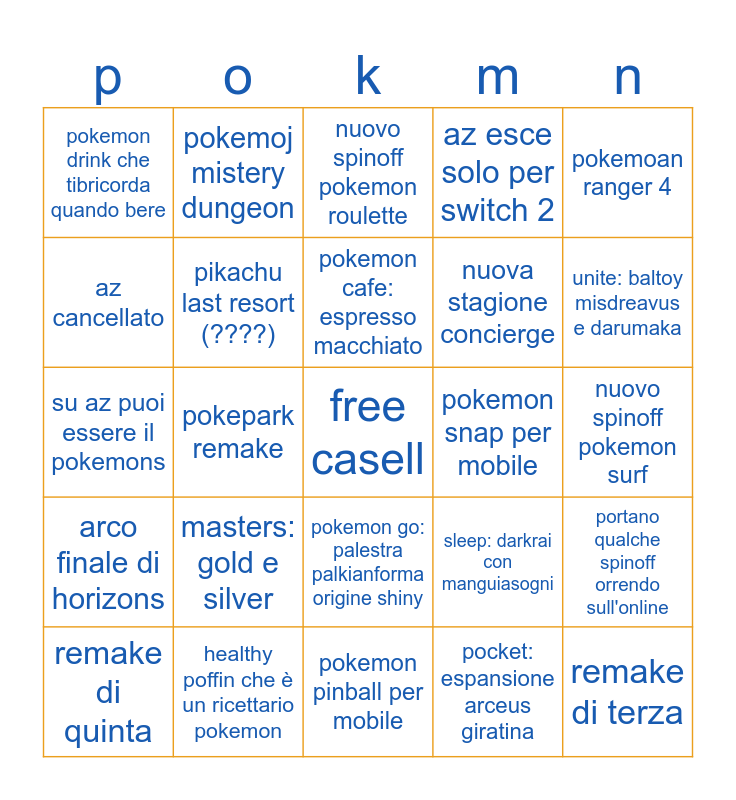 This bingo card has a free space and 24 words: masters: gold e silver, healthy poffin che è un ricettario pokemon, pokemon cafe: espresso macchiato, remake di quinta, pokemoan ranger 4, pokemon drink che tibricorda quando bere, az cancellato, pokemoj mistery dungeon, pokemon snap per mobile, pokemon go: palestra palkianforma origine shiny, nuova stagione concierge, su az puoi essere il pokemons, sleep: darkrai con manguiasogni, portano qualche spinoff orrendo sull'online, pikachu last resort (????), pocket: espansione arceus giratina, nuovo spinoff pokemon surf, nuovo spinoff pokemon roulette, unite: baltoy misdreavus e darumaka, pokepark remake, remake di terza, arco finale di horizons, az esce solo per switch 2 and pokemon pinball per mobile.