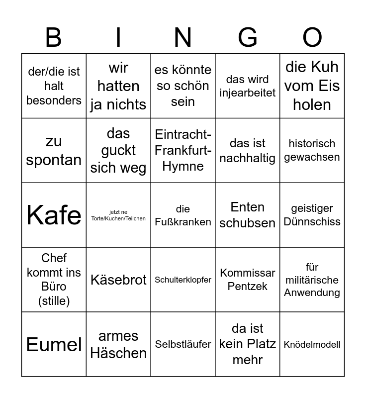 This bingo card has 58 words: Stubenältester, armes Häschen, BWL-Justus, Chef kommt ins Büro (stille), da ist kein Platz mehr, da war jemand wichtig, das guckt sich weg, das ist aber frisch hier, das ist nachhaltig, das kriegen wir nicht ran, das wird injearbeitet, das wird super, Datenschutz, denken ist schonmal ganz schlecht, der Einkauf ist schuld, der/die ist halt besonders, die Fußkranken, die Kuh vom Eis holen, ein Kollege wird als Bundeskanzler vorgeschlagen, Eintracht-Frankfurt-Hymne, Enten schubsen, es könnte so schön sein, Eumel, für militärische Anwendung, Gehacktes-Runde, geistiger Dünnschiss, Gurkentruppe, hast du mal wieder gepfuscht?, historisch gewachsen, ich bin dagegen, im falschen Papierformat gedruckt, ist das dröge hier, jemand hat nicht die Tageszeit gesagt, jemand kreist mit dem Finger in der Luft (M.F.), jemand macht das Fenster auf und geht, jemand wird in der Pause angerufen, jemand wird vom Chef versetzt, jetzt ne Torte/Kuchen/Teilchen, Kafe, Kärcher, Käsebrot, Knödelmodell, Kommissar Pentzek, mach’s doch gleich richtig, Macher, Nacharbeiten, Olek & Bolek, Schulterklopfer, Selbstläufer, Superkonzentrations- modus, Teufelszeug, von Eurest verwöhnt, Wassersuppe, weil es (oliv-) grün ist, wir hatten ja nichts, zu Adolfs Zeiten, zu spontan and zum Lippen befeuchten.