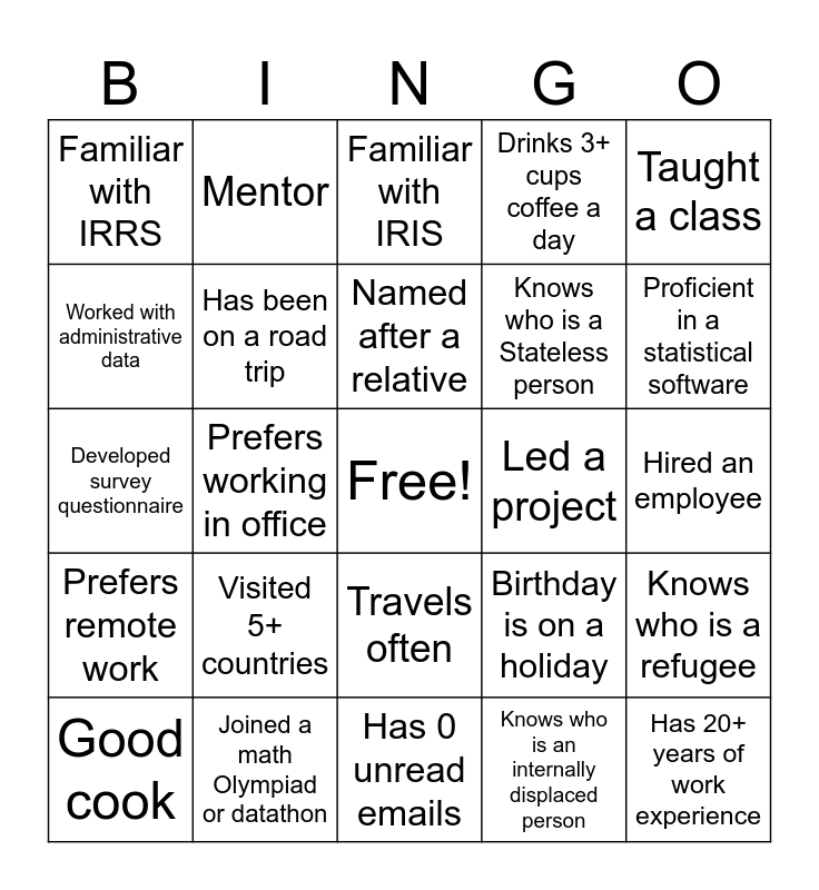This bingo card has a free space and 40 words: Has a degree in statistics, Developed survey questionnaire, Loves karaoke, Has been on a road trip, Joined a math Olympiad or datathon, Travels often, Named after a relative, Has a nickname, Taught a class, Prefers remote work, Prefers working in office, Drinks 3+ cups coffee a day, Has 20+ years of work experience, Hired an employee, Led a project, Visited 5+ countries, Speaks 2+ languages, Familiar with IRRS, Familiar with IROS, Familiar with IRIS, Knows who is a refugee, Knows who is an internally displaced person, Knows who is a Stateless person, Worked with administrative data, Worked with Census data, Climbed a mountain, Only child, Plays an instrument, Has a Masters or PhD, Comes from a big family, Has taken kid to work, Good cook, Same birth month as you, Birthday is on a holiday, Proficient in a statistical software, Has 0 unread emails, Prefers working in the morning, Prefers working at night, Mentor and Manager.