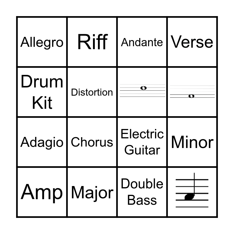 This bingo card has 3 images and 13 words: Major, Minor, Andante, Allegro, Adagio, Riff, Electric Guitar, Double Bass, Drum Kit, Distortion, Amp, Verse and Chorus.