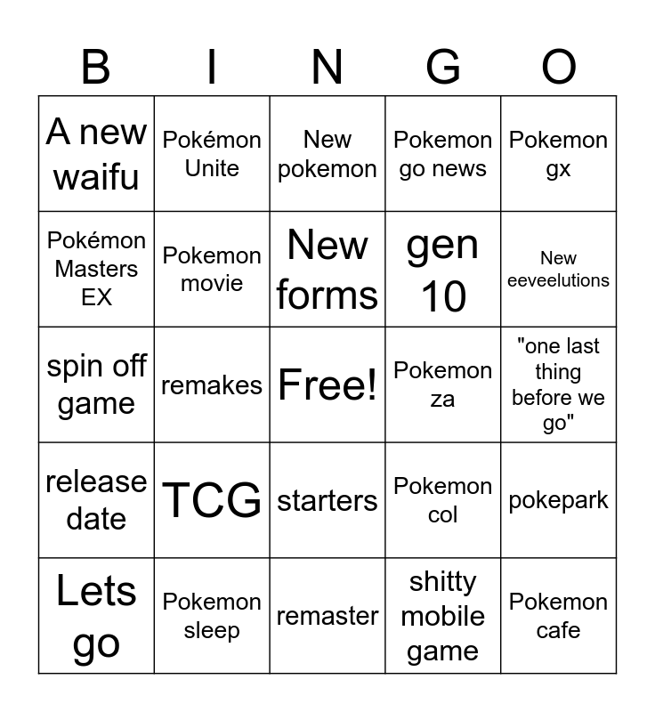 This bingo card has a free space and 24 words: TCG, Pokemon sleep, New forms, Lets go, Pokemon gx, A new waifu, Pokémon Masters EX, Pokémon Unite, Pokemon za, starters, gen 10, spin off game, Pokemon col, pokepark, Pokemon movie, shitty mobile game, "one last thing before we go", New pokemon, New eeveelutions, remakes, Pokemon cafe, release date, Pokemon go news and remaster.