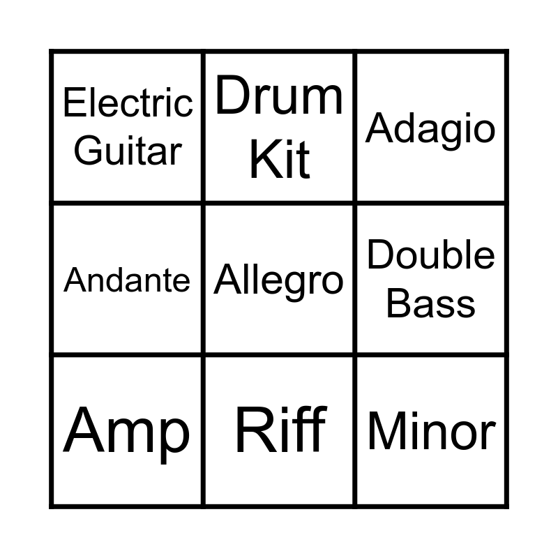This bingo card has 12 words: Major, Minor, Allegro, Double Bass, Drum Kit, Adagio, Riff, Distortion, Electric Guitar, Andante, Amp and Vocals.