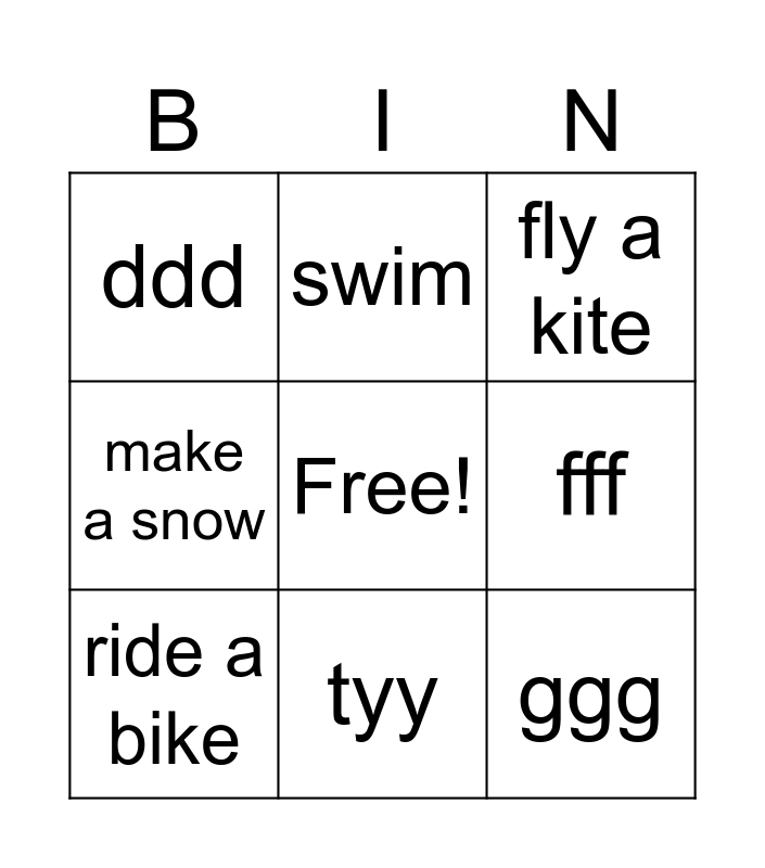 This bingo card has a free space and 9 words: ride a bike, fly a kite, swim, make a snow, ddd, fff, ggg, rrr and tyy.