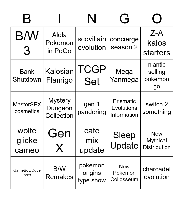 This bingo card has a free space and 24 words: Gen X, B/W Remakes, TCGP Set, GameBoy/Cube Ports, Z-A kalos starters, B/W 3, Bank Shutdown, Alola Pokemon in PoGo, Prismatic Evolutions Information, cafe mix update, Mega Yanmega, MasterSEX cosmetics, Sleep Update, New Mythical Distribution, Kalosian Flamigo, New Pokemon Collosseum, switch 2 something, scovillain evolution, niantic selling pokemon go, Mystery Dungeon Collection, charcadet evolution, wolfe glicke cameo, concierge season 2 and pokemon origins type show.