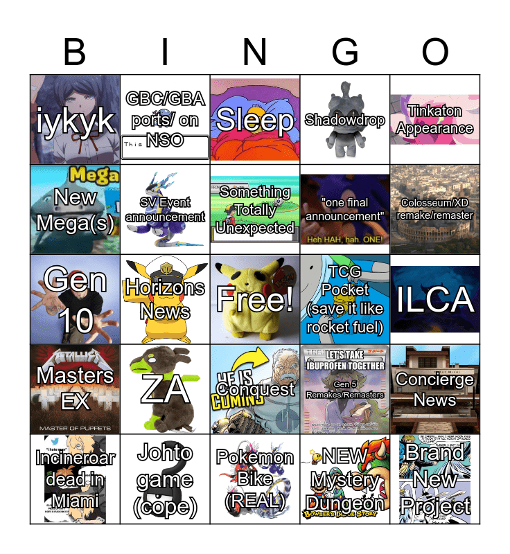 This bingo card has 24 images, a free space and 24 words: ZA, Johto game (cope), Something Totally Unexpected, Incineroar dead in Miami, Tinkaton Appearance, iykyk, New Mega(s), GBC/GBA ports/ on NSO, TCG Pocket (save it like rocket fuel), Conquest, "one final announcement", Gen 10, Gen 5 Remakes/Remasters, Concierge News, SV Event announcement, NEW Mystery Dungeon, ILCA, Sleep, Colosseum/XD remake/remaster, Horizons News, Brand New Project, Masters EX, Shadowdrop and Pokemon Bike (REAL).