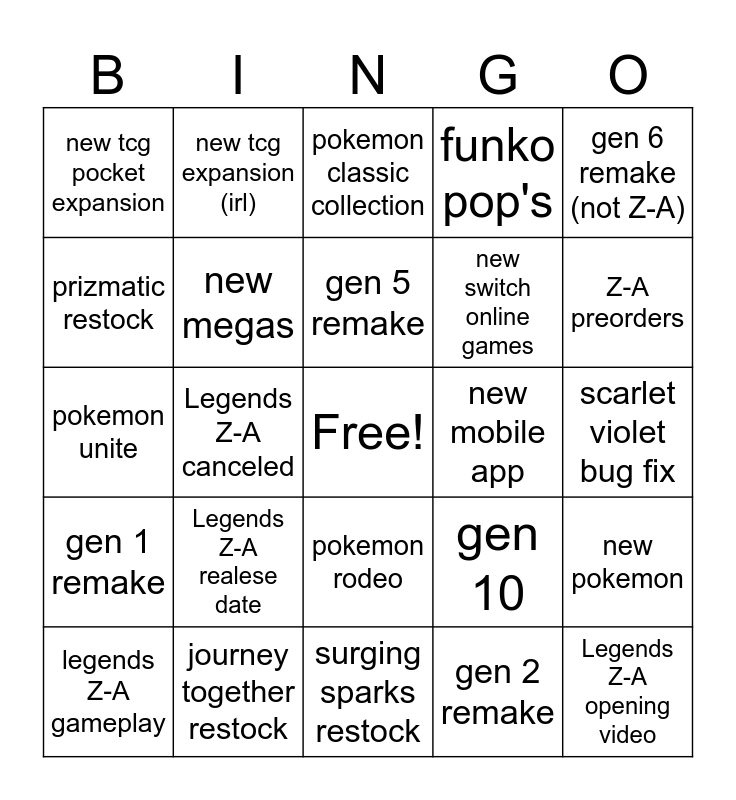 This bingo card has a free space and 24 words: legends Z-A gameplay, Legends Z-A realese date, gen 5 remake, gen 2 remake, gen 6 remake (not Z-A), new tcg pocket expansion, new tcg expansion (irl), pokemon classic collection, new mobile app, scarlet violet bug fix, pokemon unite, new megas, gen 10, new pokemon, prizmatic restock, journey together restock, surging sparks restock, funko pop's, Z-A preorders, gen 1 remake, Legends Z-A canceled, pokemon rodeo, new switch online games and Legends Z-A opening video.