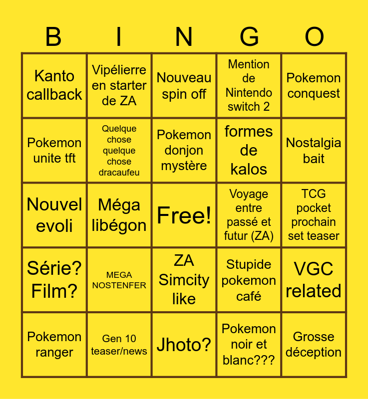 This bingo card has a free space and 24 words: MEGA NOSTENFER, Gen 10 teaser/news, Pokemon donjon mystère, Pokemon ranger, Pokemon conquest, Kanto callback, Pokemon unite tft, Vipélierre en starter de ZA, Voyage entre passé et futur (ZA), ZA Simcity like, formes de kalos, Nouvel evoli, Stupide pokemon café, VGC related, Quelque chose quelque chose dracaufeu, Pokemon noir et blanc???, TCG pocket prochain set teaser, Nouveau spin off, Nostalgia bait, Méga libégon, Grosse déception, Série? Film?, Mention de Nintendo switch 2 and Jhoto?.