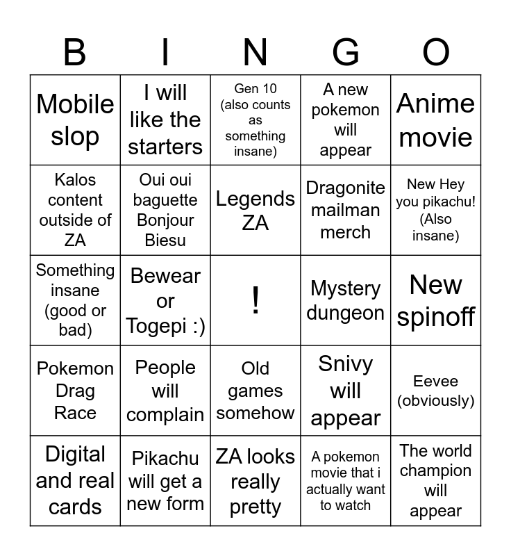 This bingo card has a free space and 24 words: People will complain, Pikachu will get a new form, Legends ZA, Digital and real cards, Anime movie, Mobile slop, Kalos content outside of ZA, I will like the starters, Mystery dungeon, Old games somehow, Dragonite mailman merch, Something insane (good or bad), Snivy will appear, Eevee (obviously), Oui oui baguette Bonjour Biesu, A pokemon movie that i actually want to watch, New spinoff, Gen 10 (also counts as something insane), New Hey you pikachu! (Also insane), Bewear or Togepi :), The world champion will appear, Pokemon Drag Race, A new pokemon will appear and ZA looks really pretty.
