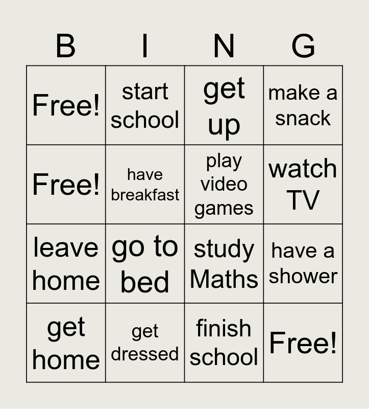 This bingo card has 16 words: get dressed, have a shower, get up, Free!, leave home, start school, study Maths, finish school, Free!, have breakfast, get home, make a snack, go to bed, watch TV, play video games and Free!.