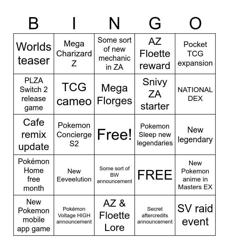 This bingo card has a free space and 25 words: New Eeveelution, AZ & Floette Lore, Mega Florges, New Pokemon mobile app game, Pocket TCG expansion, Worlds teaser, PLZA Switch 2 release game, Mega Charizard Z, Pokemon Sleep new legendaries, Some sort of BW announcement, Snivy ZA starter, Cafe remix update, FREE, New Pokemon anime in Masters EX, TCG cameo, Alolan Raichu cameo, New legendary, Some sort of new mechanic in ZA, NATIONAL DEX, Pokemon Concierge S2, SV raid event, Pokémon Voltage HIGH announcement, Pokémon Home free month, AZ Floette reward and Secret aftercredits announcement.