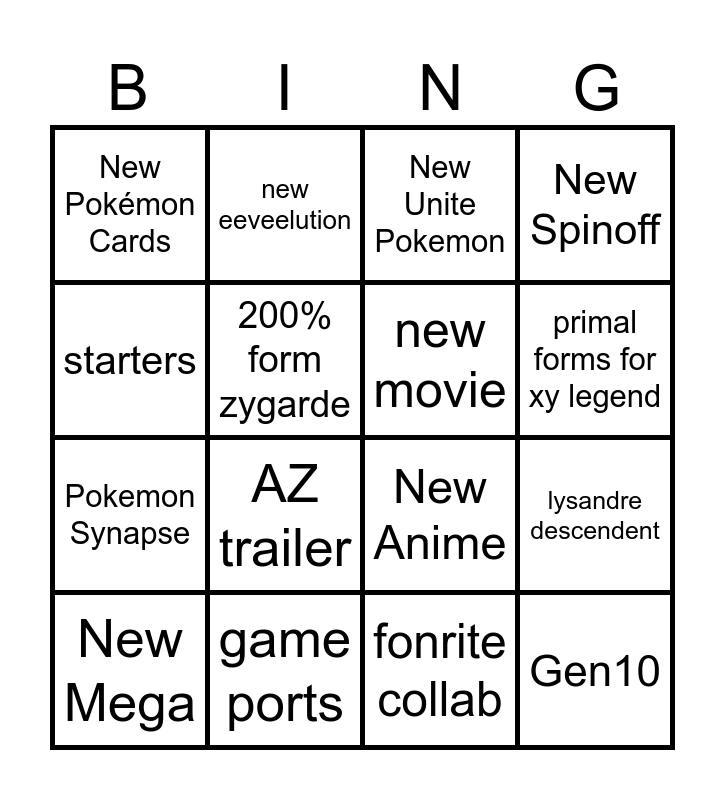 This bingo card has 18 words: AZ trailer, Gen10, New Unite Pokemon, New Pokémon Cards, New Anime, New Spinoff, New Mega, new eeveelution, primal forms for xy legend, Pokemon Synapse, fonrite collab, starters, lysandre descendent, 200% form zygarde, new movie, new tera raids for sv, game ports and new tera raids for sv.