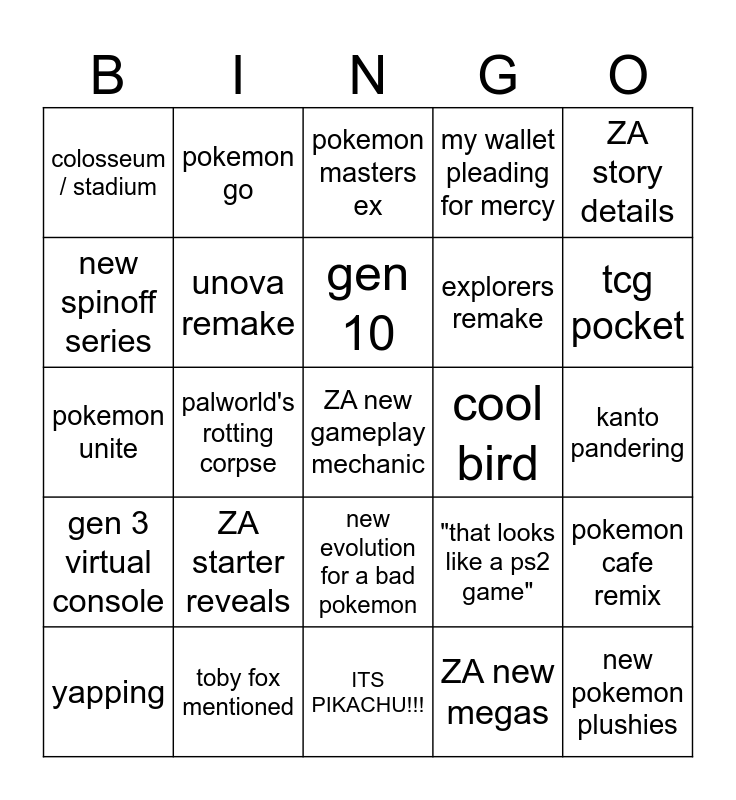 This bingo card has 25 words: ZA starter reveals, ITS PIKACHU!!!, gen 10, yapping, ZA story details, colosseum / stadium, new spinoff series, pokemon go, cool bird, new evolution for a bad pokemon, explorers remake, pokemon unite, "that looks like a ps2 game", pokemon cafe remix, unova remake, new pokemon plushies, kanto pandering, pokemon masters ex, tcg pocket, palworld's rotting corpse, ZA new gameplay mechanic, toby fox mentioned, gen 3 virtual console, my wallet pleading for mercy and ZA new megas.