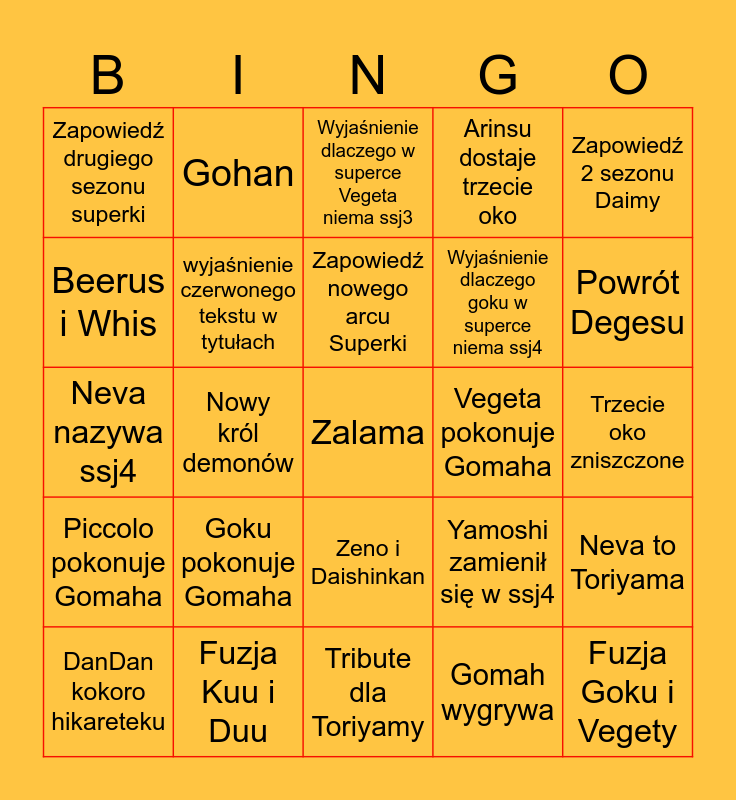 This bingo card has 25 words: Goku pokonuje Gomaha, Tribute dla Toriyamy, Zapowiedź nowego arcu Superki, DanDan kokoro hikareteku, Zapowiedź 2 sezonu Daimy, Zapowiedź drugiego sezonu superki, Beerus i Whis, Gohan, Vegeta pokonuje Gomaha, Zeno i Daishinkan, Wyjaśnienie dlaczego goku w superce niema ssj4, Neva nazywa ssj4, Yamoshi zamienił się w ssj4, Neva to Toriyama, wyjaśnienie czerwonego tekstu w tytułach, Fuzja Goku i Vegety, Trzecie oko zniszczone, Wyjaśnienie dlaczego w superce Vegeta niema ssj3, Powrót Degesu, Nowy król demonów, Zalama, Fuzja Kuu i Duu, Piccolo pokonuje Gomaha, Arinsu dostaje trzecie oko and Gomah wygrywa.