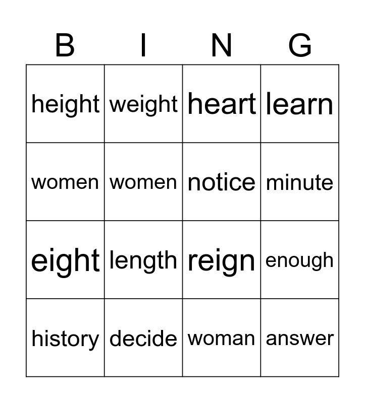 This bingo card has 16 words: decide, enough, heart, height, eight, weight, reign, woman, women, women, history, learn, length, minute, notice and answer.