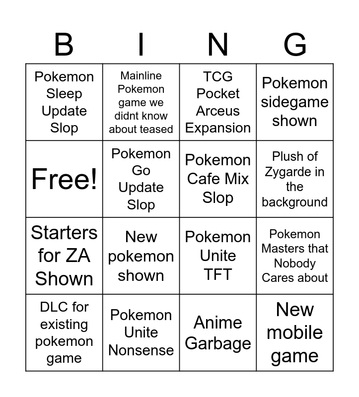 This bingo card has 16 words: Pokemon Unite Nonsense, Pokemon Masters that Nobody Cares about, TCG Pocket Arceus Expansion, Pokemon Sleep Update Slop, Starters for ZA Shown, Mainline Pokemon game we didnt know about teased, Pokemon Unite TFT, Anime Garbage, Free!, Pokemon Go Update Slop, DLC for existing pokemon game, Pokemon sidegame shown, New pokemon shown, Plush of Zygarde in the background, Pokemon Cafe Mix Slop and New mobile game.
