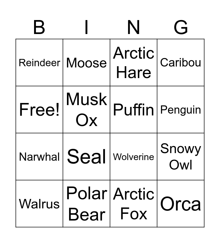 This bingo card has 16 words: Polar Bear, Snowy Owl, Arctic Hare, Reindeer, Narwhal, Moose, Wolverine, Arctic Fox, Free!, Musk Ox, Walrus, Caribou, Seal, Penguin, Puffin and Orca.
