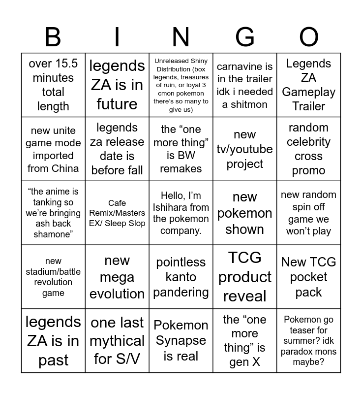 This bingo card has a free space and 24 words: new mega evolution, one last mythical for S/V, the “one more thing” is BW remakes, legends ZA is in past, Legends ZA Gameplay Trailer, over 15.5 minutes total length, new unite game mode imported from China, legends ZA is in future, new pokemon shown, pointless kanto pandering, new tv/youtube project, “the anime is tanking so we’re bringing ash back shamone”, TCG product reveal, New TCG pocket pack, legends za release date is before fall, the “one more thing” is gen X, new random spin off game we won’t play, Unreleased Shiny Distribution (box legends, treasures of ruin, or loyal 3 cmon pokemon there’s so many to give us), random celebrity cross promo, Cafe Remix/Masters EX/ Sleep Slop, Pokemon go teaser for summer? idk paradox mons maybe?, new stadium/battle revolution game, carnavine is in the trailer idk i needed a shitmon and Pokemon Synapse is real.