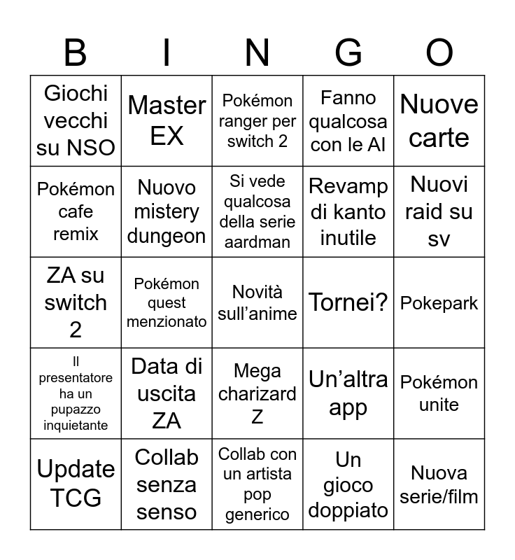 This bingo card has a free space and 24 words: Data di uscita ZA, Collab senza senso, Si vede qualcosa della serie aardman, Update TCG, Nuove carte, Giochi vecchi su NSO, Pokémon cafe remix, Master EX, Tornei?, Mega charizard Z, Revamp di kanto inutile, ZA su switch 2, Un’altra app, Pokémon unite, Nuovo mistery dungeon, Un gioco doppiato, Pokepark, Pokémon ranger per switch 2, Nuovi raid su sv, Pokémon quest menzionato, Nuova serie/film, Il presentatore ha un pupazzo inquietante, Fanno qualcosa con le AI and Collab con un artista pop generico.