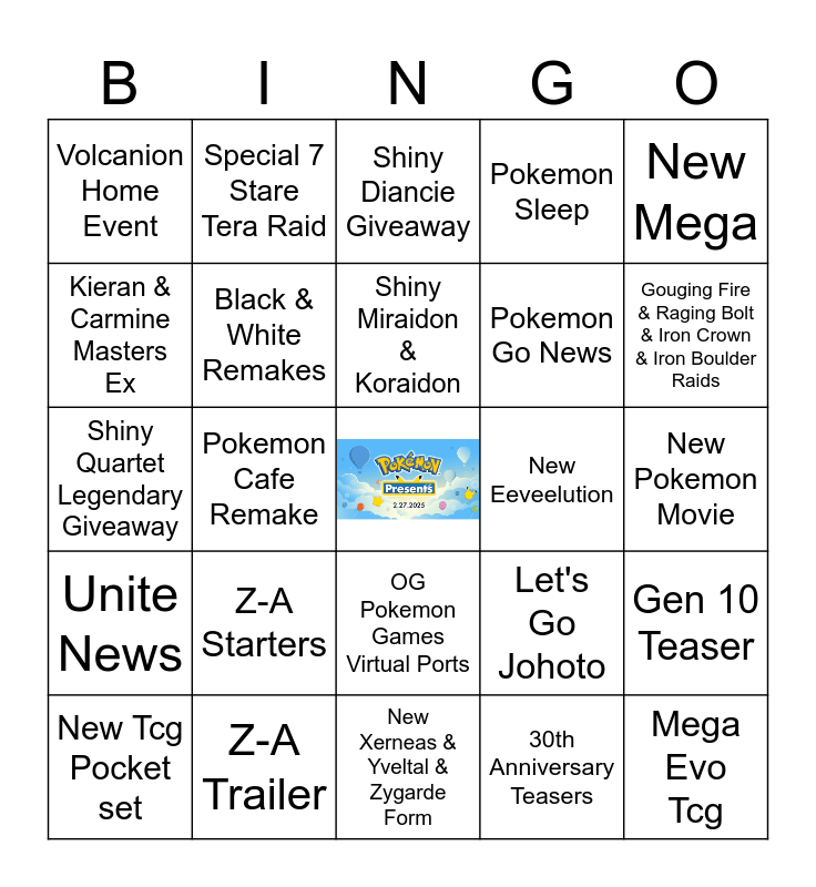 This bingo card has a free space and 24 words: Z-A Starters, Z-A Trailer, Shiny Miraidon & Koraidon, New Tcg Pocket set, New Mega, Volcanion Home Event, Kieran & Carmine Masters Ex, Special 7 Stare Tera Raid, New Eeveelution, OG Pokemon Games Virtual Ports, Pokemon Go News, Shiny Quartet Legendary Giveaway, Let's Go Johoto, Gen 10 Teaser, Black & White Remakes, 30th Anniversary Teasers, New Pokemon Movie, Shiny Diancie Giveaway, Gouging Fire & Raging Bolt & Iron Crown & Iron Boulder Raids, Pokemon Cafe Remake, Mega Evo Tcg, Unite News, Pokemon Sleep and New Xerneas & Yveltal & Zygarde Form.