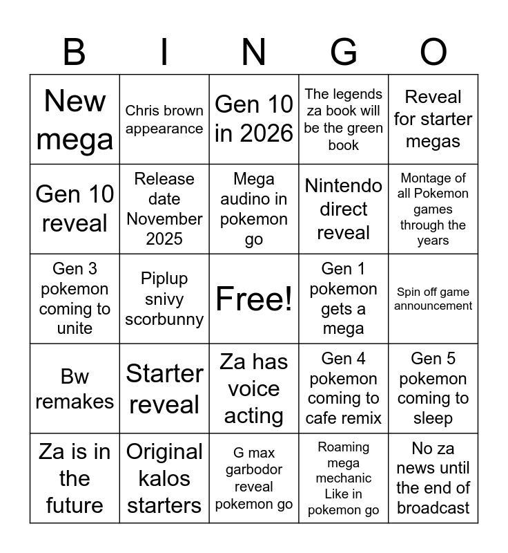 This bingo card has a free space and 24 words: Starter reveal, Original kalos starters, Mega audino in pokemon go, Za is in the future, Reveal for starter megas, New mega, Gen 10 reveal, Chris brown appearance, Gen 1 pokemon gets a mega, Za has voice acting, Nintendo direct reveal, Gen 3 pokemon coming to unite, Gen 4 pokemon coming to cafe remix, Gen 5 pokemon coming to sleep, Release date November 2025, Roaming mega mechanic Like in pokemon go, Spin off game announcement, Gen 10 in 2026, Montage of all Pokemon games through the years, Piplup snivy scorbunny, No za news until the end of broadcast, Bw remakes, The legends za book will be the green book and G max garbodor reveal pokemon go.