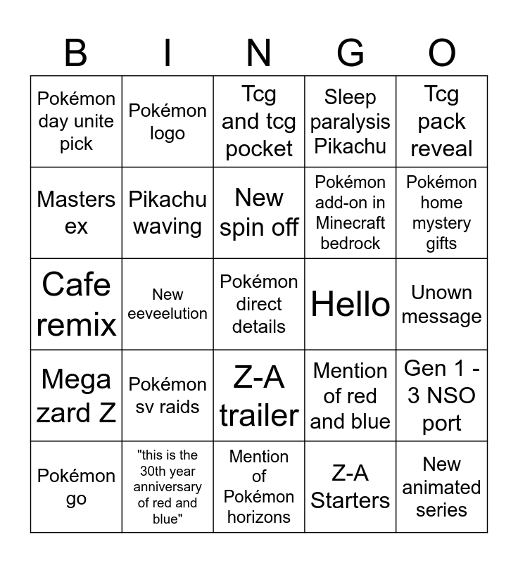 This bingo card has a free space and 24 words: Pokémon go, Pokémon sv raids, New spin off, Z-A Starters, Tcg pack reveal, Pokémon day unite pick, Pokémon logo, Tcg and tcg pocket, Hello, Unown message, Cafe remix, Pikachu waving, Mention of red and blue, Gen 1 - 3 NSO port, Masters ex, "this is the 30th year anniversary of red and blue", Mention of Pokémon horizons, Sleep paralysis Pikachu, Pokémon home mystery gifts, Mega zard Z, New eeveelution, Z-A trailer, Pokémon add-on in Minecraft bedrock and New animated series.