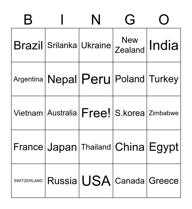 This bingo card has a free space and 25 words: Japan, USA, Peru, SWITZERLAND, India, Brazil, Argentina, Srilanka, S.korea, Thailand, Poland, Vietnam, China, Egypt, Nepal, Italy, Zimbabwe, Ukraine, Turkey, Australia, Greece, Russia, France, New Zealand and Canada.