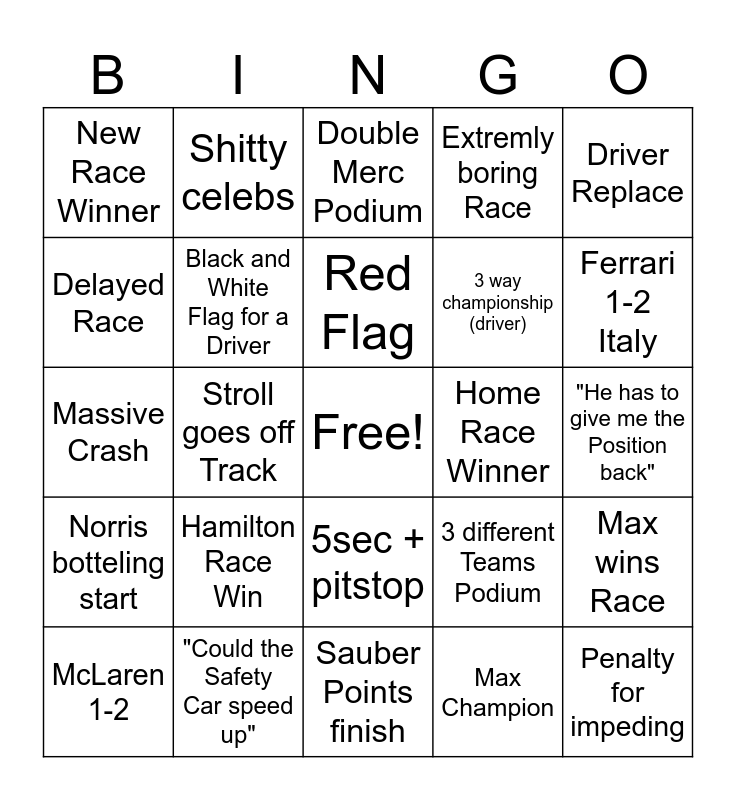 This bingo card has a free space and 25 words: Hamilton Race Win, Sauber Points finish, Red Flag, McLaren 1-2, Driver Replace, New Race Winner, Delayed Race, Shitty celebs, Home Race Winner, 5sec + pitstop, 3 way championship (driver), Massive Crash, 3 different Teams Podium, Max wins Race, Black and White Flag for a Driver, Funny Team Radio, "He has to give me the Position back", Double Merc Podium, Ferrari 1-2 Italy, Stroll goes off Track, Penalty for impeding, "Could the Safety Car speed up", Norris botteling start, Extremly boring Race and Max Champion.