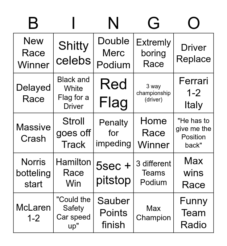 This bingo card has 25 words: Hamilton Race Win, Sauber Points finish, Red Flag, McLaren 1-2, Driver Replace, New Race Winner, Delayed Race, Shitty celebs, Home Race Winner, 5sec + pitstop, 3 way championship (driver), Massive Crash, 3 different Teams Podium, Max wins Race, Black and White Flag for a Driver, Funny Team Radio, "He has to give me the Position back", Double Merc Podium, Ferrari 1-2 Italy, Stroll goes off Track, Penalty for impeding, "Could the Safety Car speed up", Norris botteling start, Extremly boring Race and Max Champion.