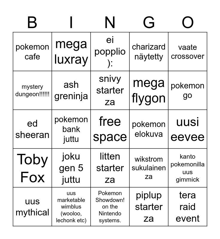 This bingo card has a free space and 24 words: joku gen 5 juttu, uus marketable wimblus (wooloo, lechonk etc), snivy starter za, uus mythical, vaate crossover, pokemon cafe, mystery dungeon!!!!!!, mega luxray, pokemon elokuva, litten starter za, mega flygon, ed sheeran, wikstrom sukulainen za, kanto pokemonilla uus gimmick, ash greninja, piplup starter za, uusi eevee, ei popplio ):, pokemon go, pokemon bank juttu, tera raid event, Toby Fox, charizard näytetty and Pokemon Showdown! on the Nintendo systems..