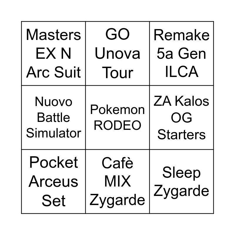 This bingo card has a free space and 8 words: ZA Kalos OG Starters, Remake 5a Gen ILCA, GO Unova Tour, Pocket Arceus Set, Masters EX N Arc Suit, Sleep Zygarde, Nuovo Battle Simulator and Cafè MIX Zygarde.