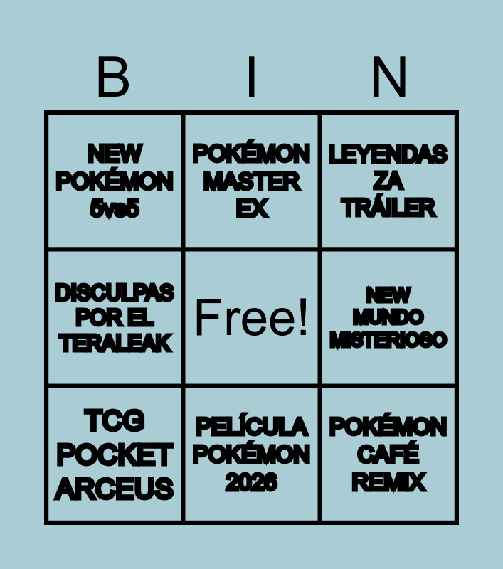 This bingo card has a free space and 8 words: NEW MUNDO MISTERIOSO, LEYENDAS ZA TRÁILER, POKÉMON MASTER EX, TCG POCKET ARCEUS, NEW POKÉMON 5vs5, POKÉMON CAFÉ REMIX, DISCULPAS POR EL TERALEAK and PELÍCULA POKÉMON 2026.