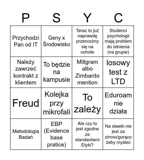 This bingo card has 16 words: EBP (Evidence base pratice), Eduroam nie działa, Teraz to już naprawdę przenosimy się na ochote, Przychodzi Pan od IT, Freud, Geny x Środowisko, To zależy, Ale czy to jest zgodne ze standardami Etyki?, Należy zawrzeć kontrakt z klientem, To będzie na kampusie, Metodologia Badań, Studenci psychologii mają problem do istnienia (na grupie), Kolejka przy mikrofali, losowy test z LTD, Millgram albo Zimbardo mention and Na stawki nie jest za zimno/gorąco żeby myśleć.