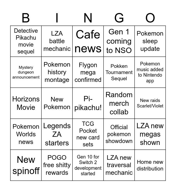 This bingo card has a free space and 24 words: Legends ZA starters, POGO free shitty rewards, Flygon mega confirmed, New spinoff, Pokemon sleep update, Detective Pikachu movie sequel, Mystery dungeon announcement, LZA battle mechanic, Random merch collab, TCG Pocket new card sets, Pokken Tournament Sequel, Horizons Movie, Official pokemon showdown, LZA new megas shown, Pokemon history montage, LZA new traversal mechanic, New raids Scarlet/Violet, Cafe news, Pokemon music added to Nintendo app, New Pokemon, Home new distribution, Pokemon Worlds news, Gen 1 coming to NSO and Gen 10 for Switch 2 development started.