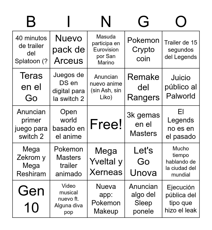 This bingo card has a free space and 24 words: Pokemon Masters trailer animado, Video musical nuevo ft. Alguna diva pop, Anuncian nuevo anime (sin Ash, sin Liko), Gen 10, Trailer de 15 segundos del Legends, 40 minutos de trailer del Splatoon (?, Teras en el Go, Nuevo pack de Arceus, 3k gemas en el Masters, Mega Yveltal y Xerneas, Remake del Rangers, Anuncian primer juego para switch 2, Let's Go Unova, Mucho tiempo hablando de la ciudad del mundial, Juegos de DS en digital para la switch 2, Anuncian algo del Sleep ponele, El Legends no es en el pasado, Masuda participa en Eurovision por San Marino, Juicio público al Palworld, Open world basado en el anime, Ejecución pública del tipo que hizo el leak, Mega Zekrom y Mega Reshiram, Pokemon Crypto coin and Nueva app: Pokemon Makeup.