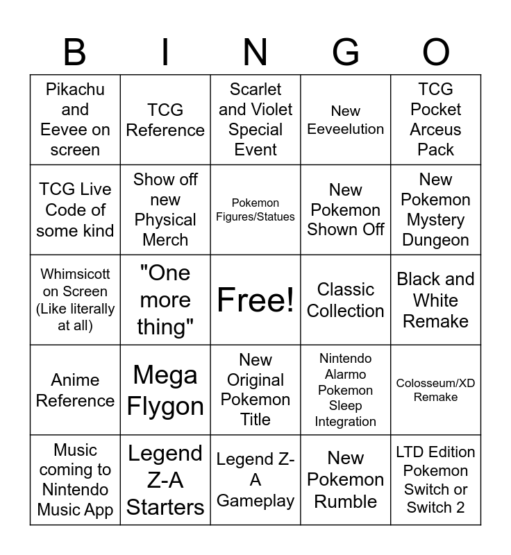 This bingo card has a free space and 24 words: Mega Flygon, Legend Z-A Starters, Pokemon Figures/Statues, Music coming to Nintendo Music App, TCG Pocket Arceus Pack, Pikachu and Eevee on screen, TCG Live Code of some kind, TCG Reference, Classic Collection, New Original Pokemon Title, New Pokemon Shown Off, Whimsicott on Screen (Like literally at all), Nintendo Alarmo Pokemon Sleep Integration, Colosseum/XD Remake, Show off new Physical Merch, New Pokemon Rumble, Black and White Remake, Scarlet and Violet Special Event, New Pokemon Mystery Dungeon, "One more thing", LTD Edition Pokemon Switch or Switch 2, Anime Reference, New Eeveelution and Legend Z-A Gameplay.
