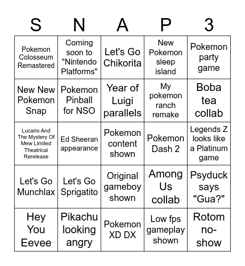 This bingo card has a free space and 24 words: Let's Go Sprigatito, Pikachu looking angry, Year of Luigi parallels, Hey You Eevee, Pokemon party game, Pokemon Colosseum Remastered, New New Pokemon Snap, Coming soon to "Nintendo Platforms", Pokemon Dash 2, Original gameboy shown, My pokemon ranch remake, Lucario And The Mystery Of Mew Limited Theatrical Rerelease, Among Us collab, Psyduck says "Gua?", Pokemon Pinball for NSO, Low fps gameplay shown, Legends Z looks like a Platinum game, Let's Go Chikorita, Boba tea collab, Ed Sheeran appearance, Rotom no-show, Let's Go Munchlax, New Pokemon sleep island and Pokemon XD DX.