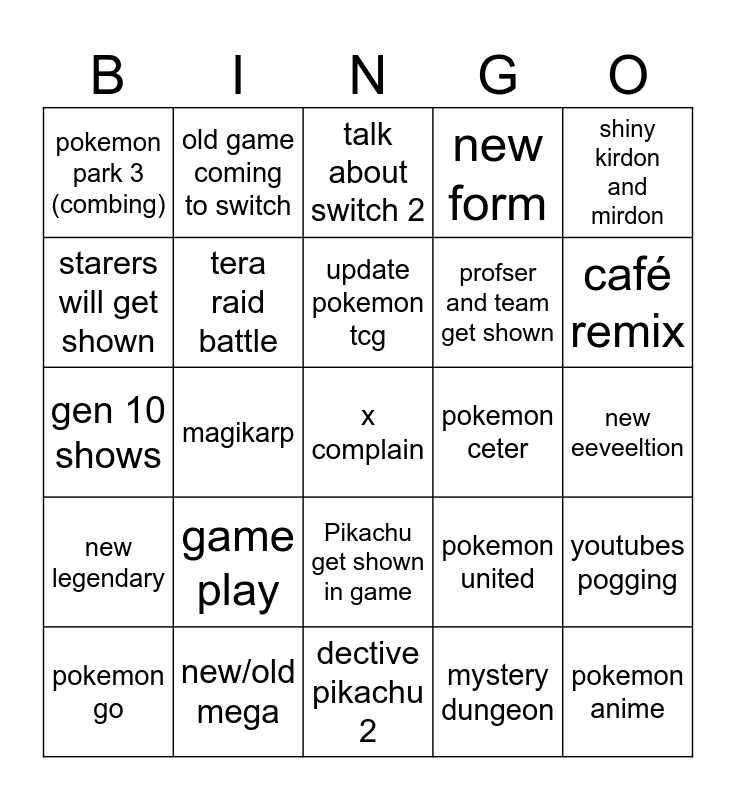 This bingo card has a free space and 24 words: game play, new/old mega, update pokemon tcg, pokemon go, shiny kirdon and mirdon, pokemon park 3 (combing), starers will get shown, old game coming to switch, pokemon ceter, Pikachu get shown in game, profser and team get shown, gen 10 shows, pokemon united, youtubes pogging, tera raid battle, mystery dungeon, new eeveeltion, talk about switch 2, café remix, magikarp, pokemon anime, new legendary, new form and dective pikachu 2.