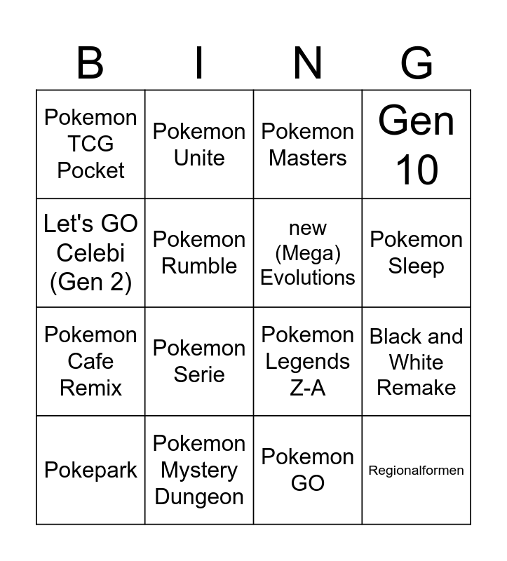 This bingo card has 16 words: Pokemon Mystery Dungeon, Black and White Remake, Pokemon Masters, Pokemon TCG Pocket, Pokemon Cafe Remix, Pokemon Unite, Pokemon Legends Z-A, Pokemon GO, Let's GO Celebi (Gen 2), Pokemon Rumble, Pokepark, Gen 10, Pokemon Serie, Pokemon Sleep, new (Mega) Evolutions and Regionalformen.