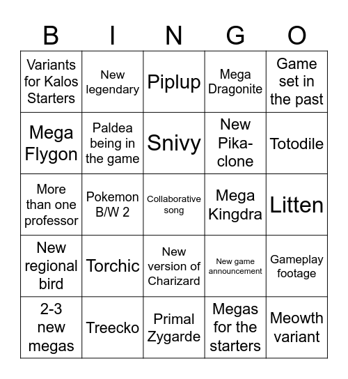 This bingo card has a free space and 24 words: Torchic, Treecko, Snivy, 2-3 new megas, Game set in the past, Variants for Kalos Starters, Mega Flygon, New legendary, Mega Kingdra, New version of Charizard, New Pika-clone, More than one professor, New game announcement, Gameplay footage, Paldea being in the game, Megas for the starters, Litten, Piplup, Totodile, Pokemon B/W 2, Meowth variant, New regional bird, Mega Dragonite and Primal Zygarde.