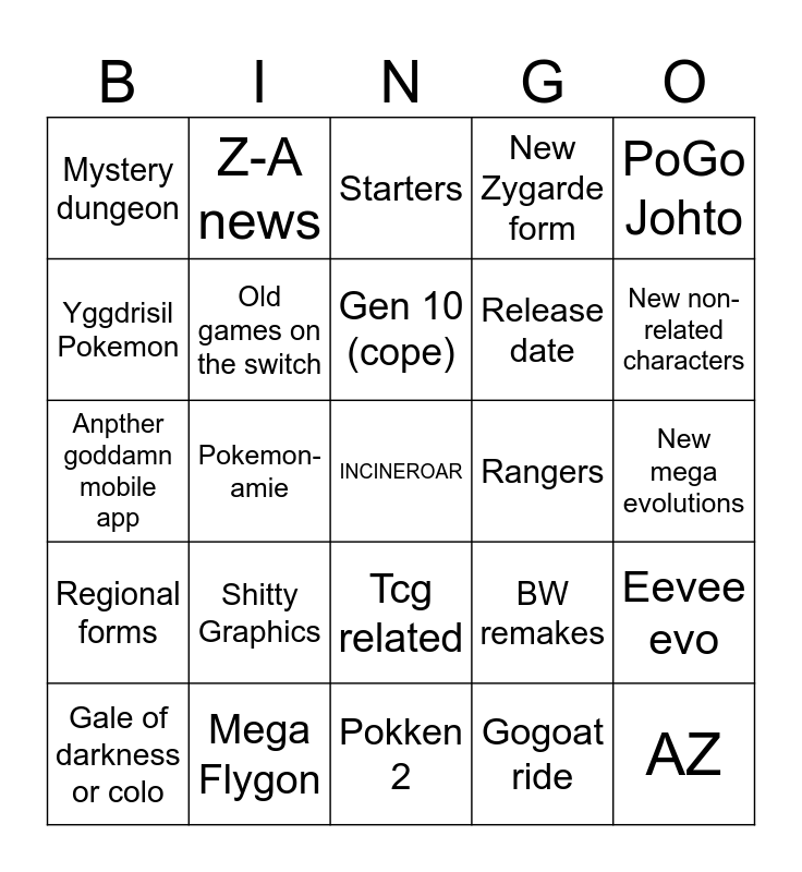 This bingo card has a free space and 24 words: Shitty Graphics, Mega Flygon, Gen 10 (cope), Gale of darkness or colo, PoGo Johto, Mystery dungeon, Yggdrisil Pokemon, Z-A news, Rangers, Tcg related, Release date, Anpther goddamn mobile app, BW remakes, Eevee evo, Old games on the switch, Gogoat ride, New mega evolutions, Starters, New non-related characters, Pokemon-amie, AZ, Regional forms, New Zygarde form and Pokken 2.