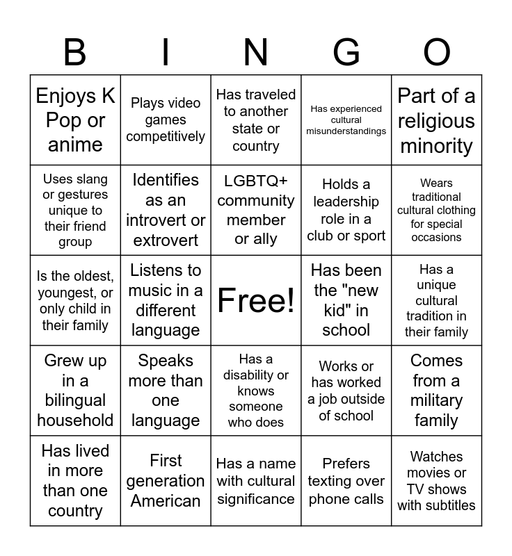 This bingo card has a free space and 24 words: Speaks more than one language, First generation American, LGBTQ+ community member or ally, Has lived in more than one country, Part of a religious minority, Enjoys K Pop or anime, Uses slang or gestures unique to their friend group, Plays video games competitively, Has been the "new kid" in school, Has a disability or knows someone who does, Holds a leadership role in a club or sport, Is the oldest, youngest, or only child in their family, Works or has worked a job outside of school, Comes from a military family, Identifies as an introvert or extrovert, Prefers texting over phone calls, Has a unique cultural tradition in their family, Has traveled to another state or country, Wears traditional cultural clothing for special occasions, Listens to music in a different language, Watches movies or TV shows with subtitles, Grew up in a bilingual household, Has experienced cultural misunderstandings and Has a name with cultural significance.
