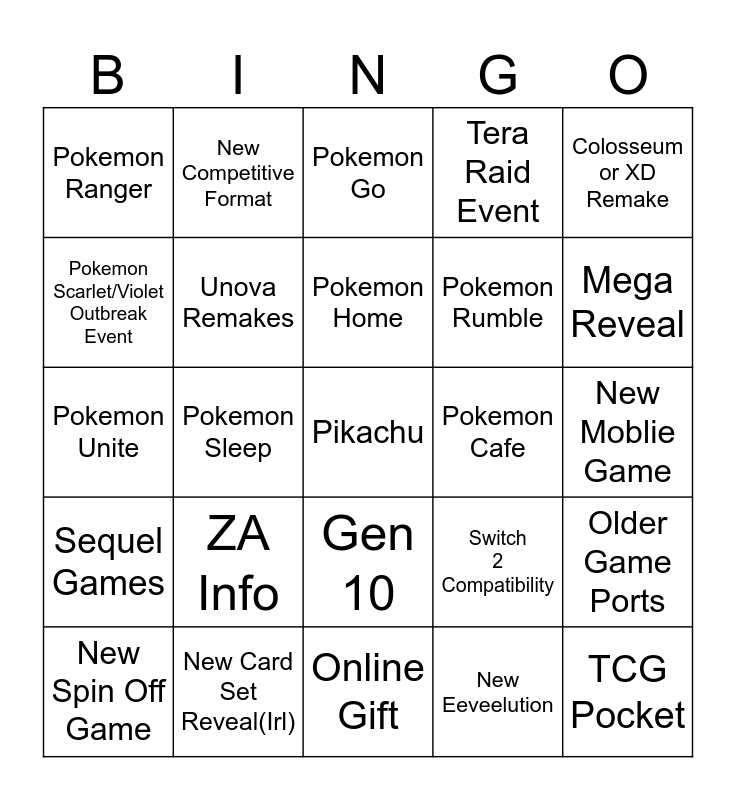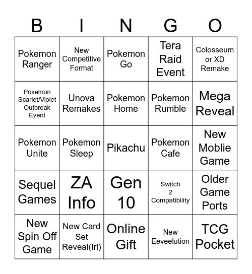 This bingo card has a free space and 24 words: ZA Info, New Card Set Reveal(Irl), Pokemon Home, New Spin Off Game, Colosseum or XD Remake, Pokemon Ranger, Pokemon Scarlet/Violet Outbreak Event, New Competitive Format, Pokemon Cafe, Gen 10, Pokemon Rumble, Pokemon Unite, Switch 2 Compatibility, Older Game Ports, Unova Remakes, New Eeveelution, New Moblie Game, Pokemon Go, Mega Reveal, Pokemon Sleep, TCG Pocket, Sequel Games, Tera Raid Event and Online Gift.