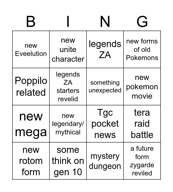 This bingo card has 16 words: some think on gen 10, tera raid battle, legends ZA, new Eveelution, new mega, new unite character, Tgc pocket news, mystery dungeon, Poppilo related, legends ZA starters revelid, new rotom form, new forms of old Pokemons, new legendary/ mythical, new pokemon movie, something unexpected and a future form zygarde reviled.