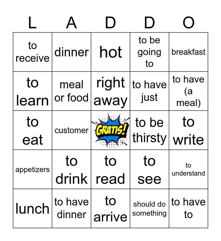 This bingo card has a free space and 33 words: occupied table, server, customer, check (restaurant), appetizers, meal or food, breakfast, lunch, dinner, surprise, right away, hot, cold, to be hungry, to be thirsty, to have (a meal), to have dinner, to eat, to drink, to see, to read, to open, to receive, to write, to arrive, to have to, to be going to, to have just, to learn, to understand, to think/not think so, should do something and to live.