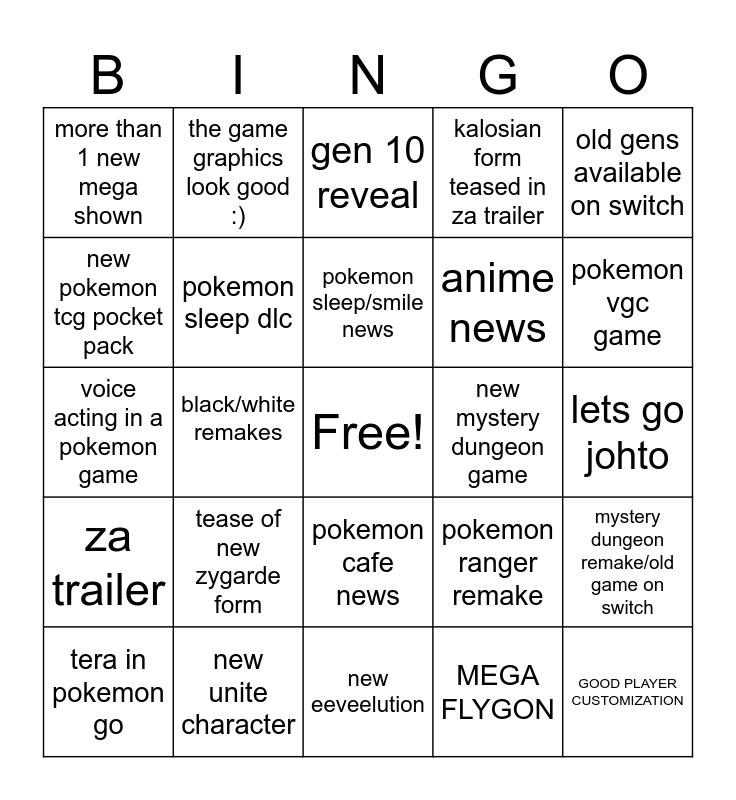 This bingo card has a free space and 25 words: za trailer, new unite character, new eeveelution, MEGA FLYGON, old gens available on switch, more than 1 new mega shown, the game graphics look good :), gen 10 reveal, new mystery dungeon game, mystery dungeon remake/old game on switch, new pokemon tcg pocket pack, pokemon sleep dlc, s/v news: gift or tera raids, pokemon ranger remake, pokemon vgc game, tera in pokemon go, black/white remakes, pokemon sleep/smile news, anime news, lets go johto, voice acting in a pokemon game, tease of new zygarde form, pokemon cafe news, kalosian form teased in za trailer and GOOD PLAYER CUSTOMIZATION.