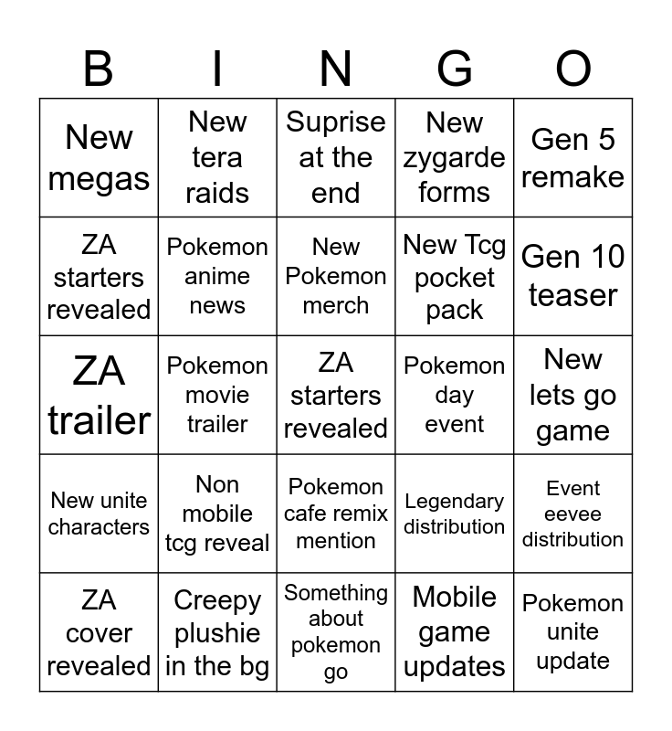 This bingo card has a free space and 24 words: Non mobile tcg reveal, Creepy plushie in the bg, New Pokemon merch, ZA cover revealed, Gen 5 remake, New megas, ZA starters revealed, New tera raids, Pokemon day event, Pokemon cafe remix mention, New Tcg pocket pack, ZA trailer, Legendary distribution, Event eevee distribution, Pokemon anime news, Mobile game updates, New lets go game, Suprise at the end, Gen 10 teaser, Pokemon movie trailer, Pokemon unite update, New unite characters, New zygarde forms and Something about pokemon go.
